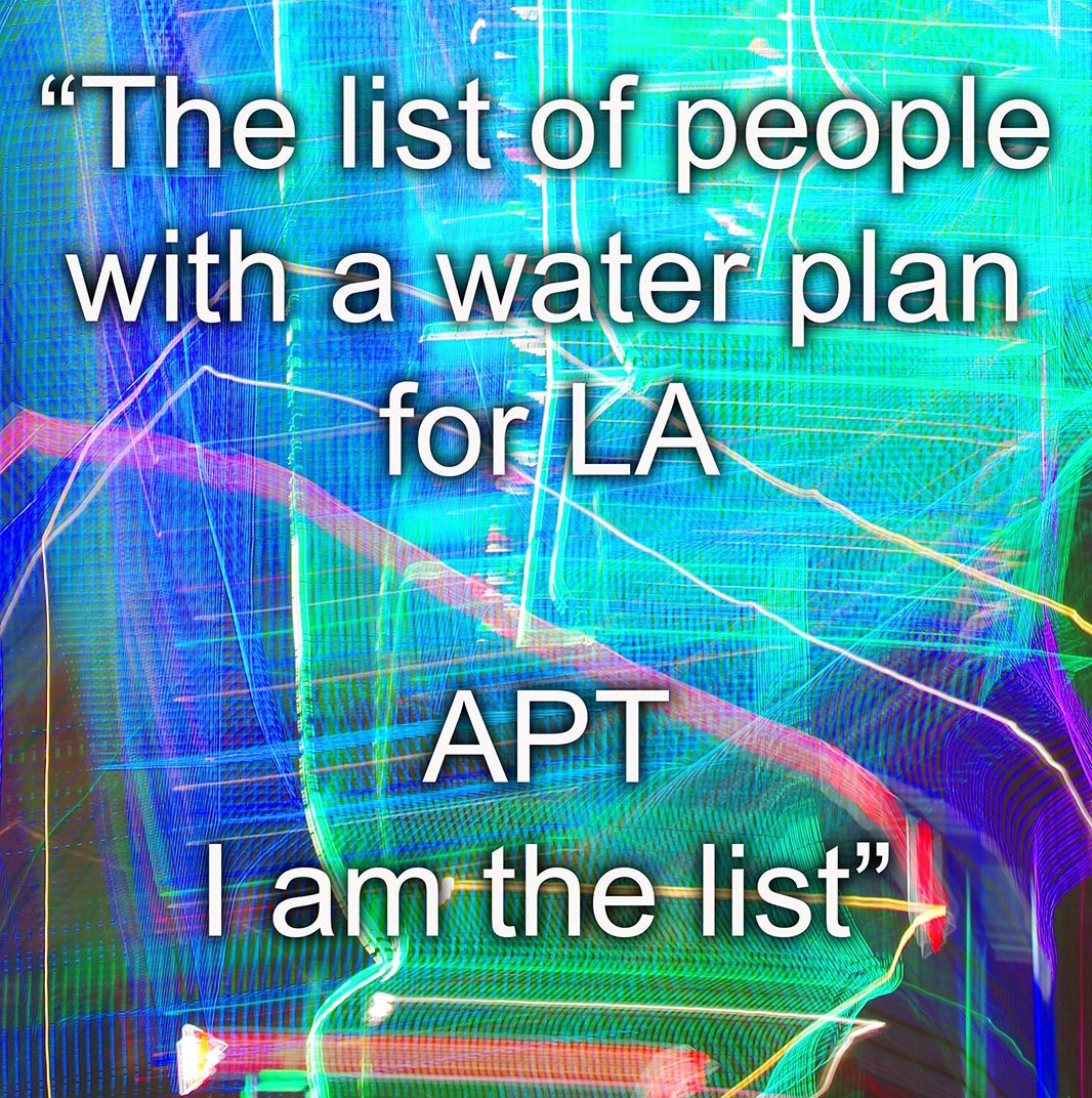 APT is a lifelong artist who financed his creative expression first with several years in construction, followed by a few years in radio and tv broadcasting. He then spent over 20 years in transportation and 5 years in public speaking. The book covers William Mulholland and the theft of the Owens River. It also explores in depth the concreting of the LA River. The artist even gives away an invention in the course of the book.