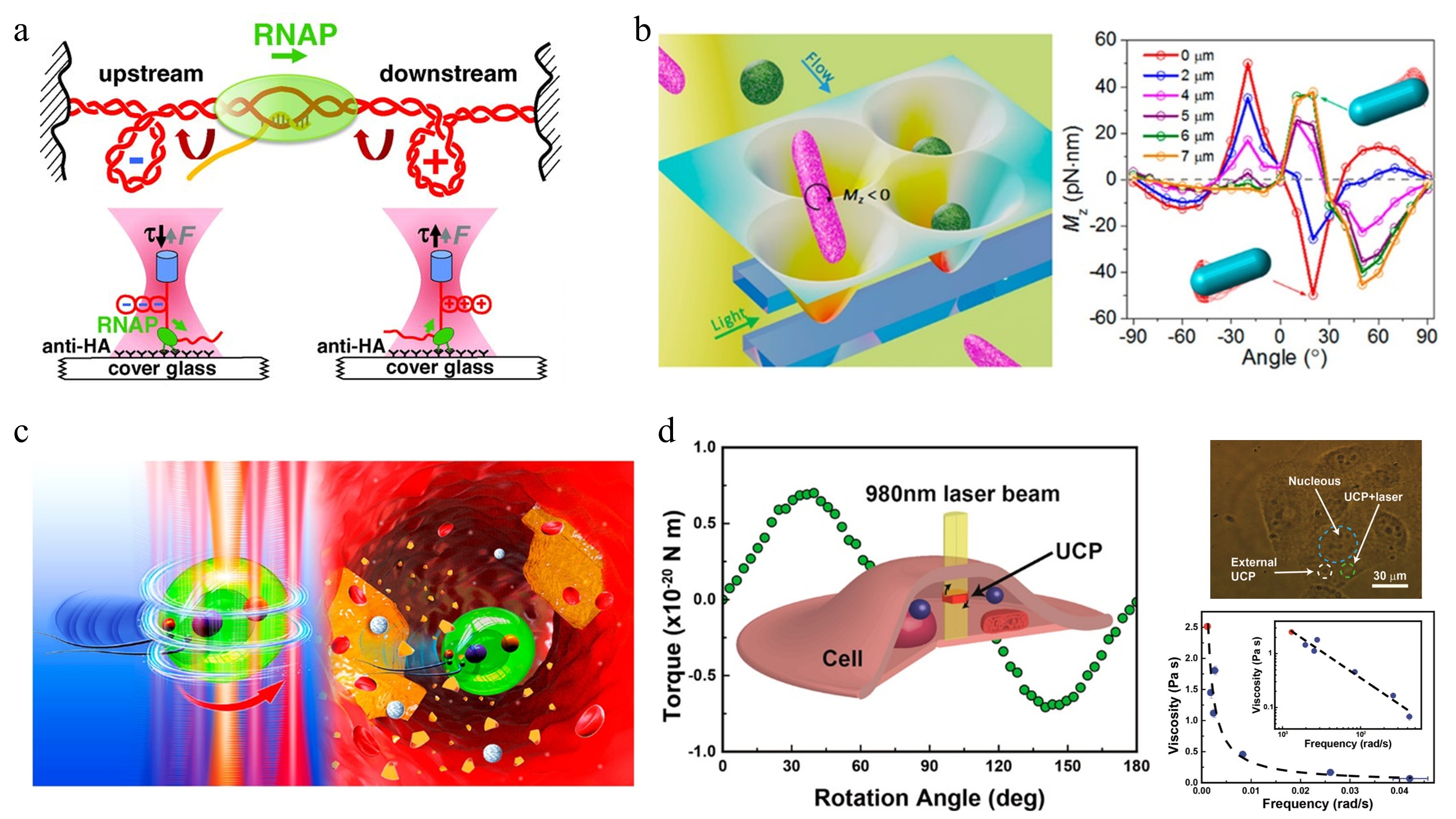 With the development of optical torque theory and experimental techniques, its applications have expanded across physics and biology. In physics, researchers have employed optical “torque wrenches” to control the rotation of micro- and nanoparticles, enabling high-sensitivity mechanical measurements, microfluidic pump actuation, and the construction of novel nanosensors. In biology, as shown in Figure 2, optical torque, with its non-contact and high-precision advantages, can directly probe the biological torque of DNA, aiding studies of gene regulation mechanisms. It can also efficiently sort cells and bacteria of different shapes and facilitate the development of biological micromotors and drug delivery systems. Additionally, optical torque can be used to measure intracellular fluid viscosity, providing unique tools for life sciences research.