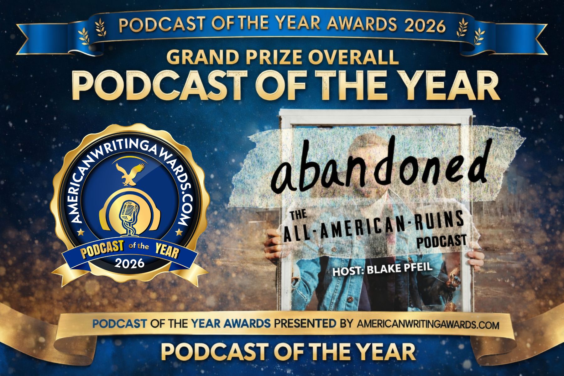The Grand Prize for Overall Podcast of the Year has been awarded to abandoned: The All-American Ruins Podcast, hosted by Blake Pfeil.