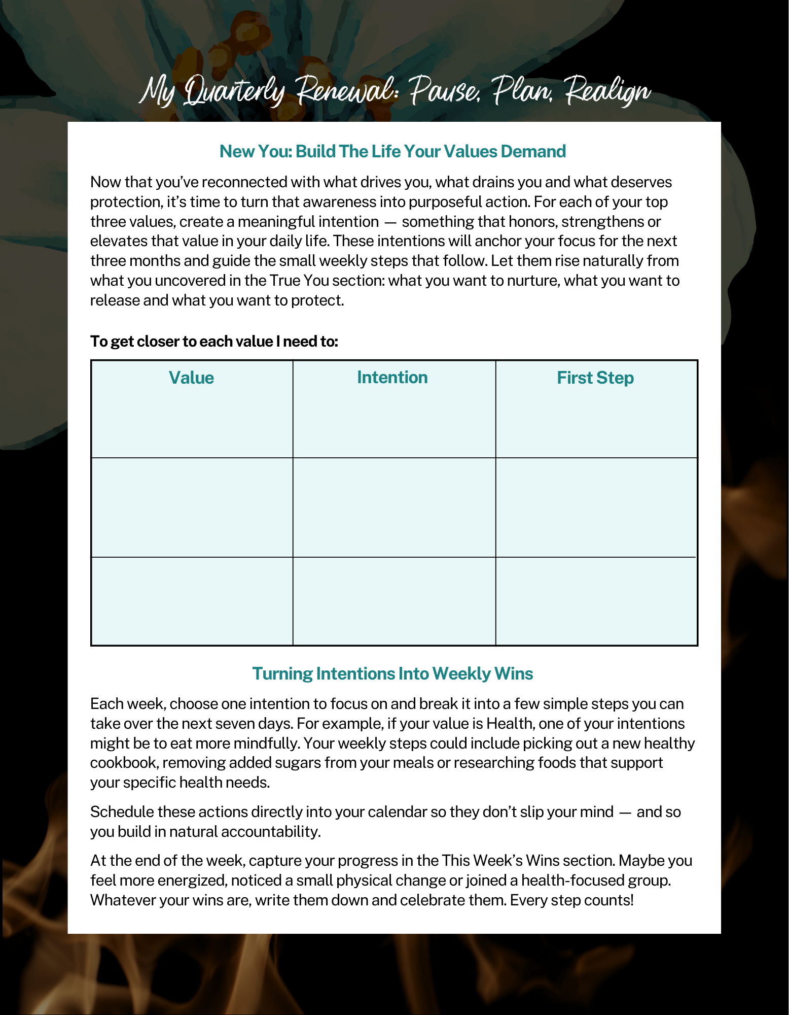 • Quarterly Renewals to revisit values and clarify intentions