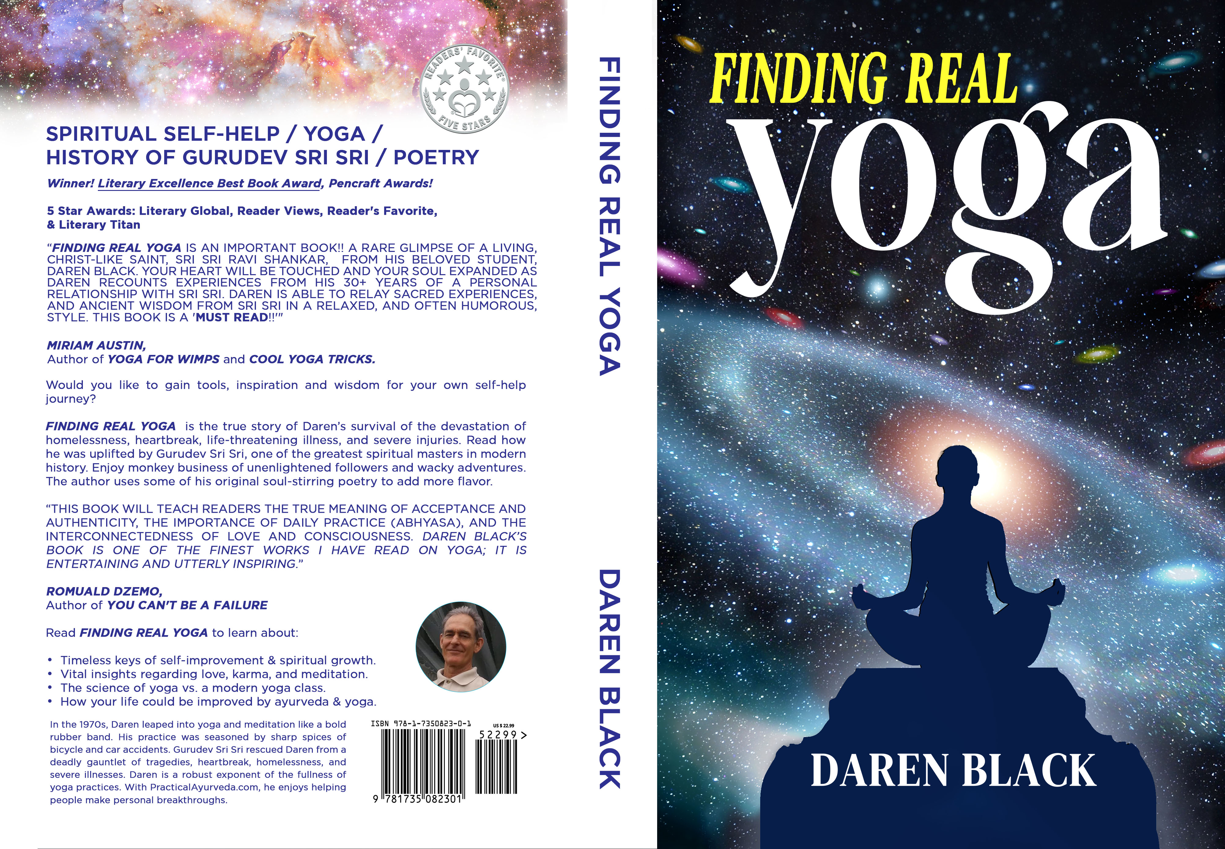 “FINDING REAL YOGA is an important book!! A rare glimpse of a living, Christ-like saint, Sri Sri Ravi Shankar, from his beloved student, Daren Black. Your heart will be touched and your soul expanded as Daren recounts experiences from his 30+ years of a personal relationship with Sri Sri. Daren is able to relay sacred experiences, and ancient wisdom from Sri Sri in a relaxed, and often humorous, style. FINDING REAL YOGA is a ‘MUST READ!!’” — Miriam Austin, author of Yoga for Wimps and Cool Yoga Tricks