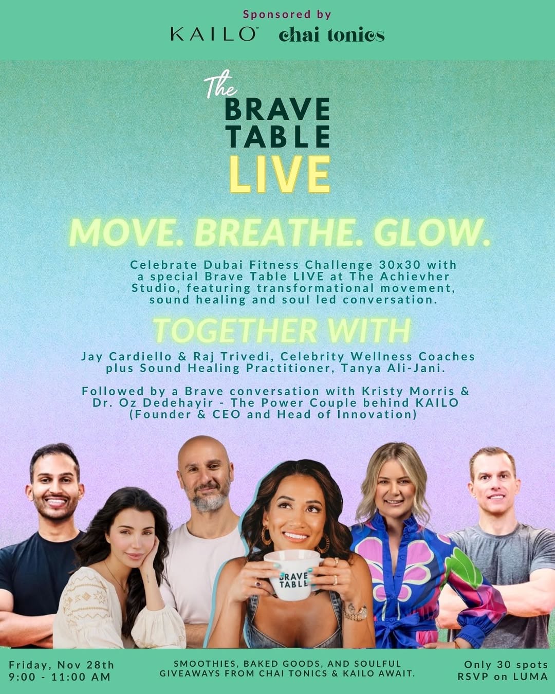 DUBAI, DUBAI, UNITED ARAB EMIRATES, December 3, 2025 /EINPresswire.com/ — Brave Table Live and KAILO announce a new collaborative wellness experience taking place on Friday, 28 November 2025, from 9:00 am to 11:00 am at Achievher Studio in Dubai. This immersive morning is designed to bring together movement, mindfulness, emotional wellbeing, and meaningful conversation for both The Brave Table and KAILO communities.