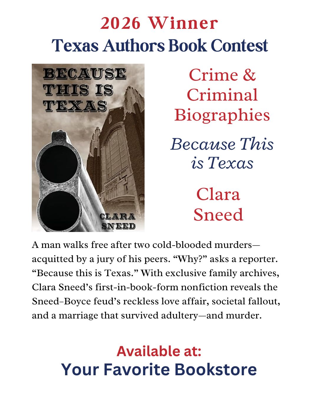 LOS ANGELES, CA, UNITED STATES, February 26, 2026 /EINPresswire.com/ — Award-winning author Clara Sneed has received top literary honors from the Texas Authors Institute for her powerful works chronicling one of Texas’s most notorious historical conflicts. Her nonfiction crime narrative, Because This Is Texas: An Account of the Sneed-Boyce Feud, has received the Best Crime/Criminal honor, while her historical novel Before We Turn To Dust earned both Best Literary Historical Fiction and the competition’s highest distinction, the Grand Prize.