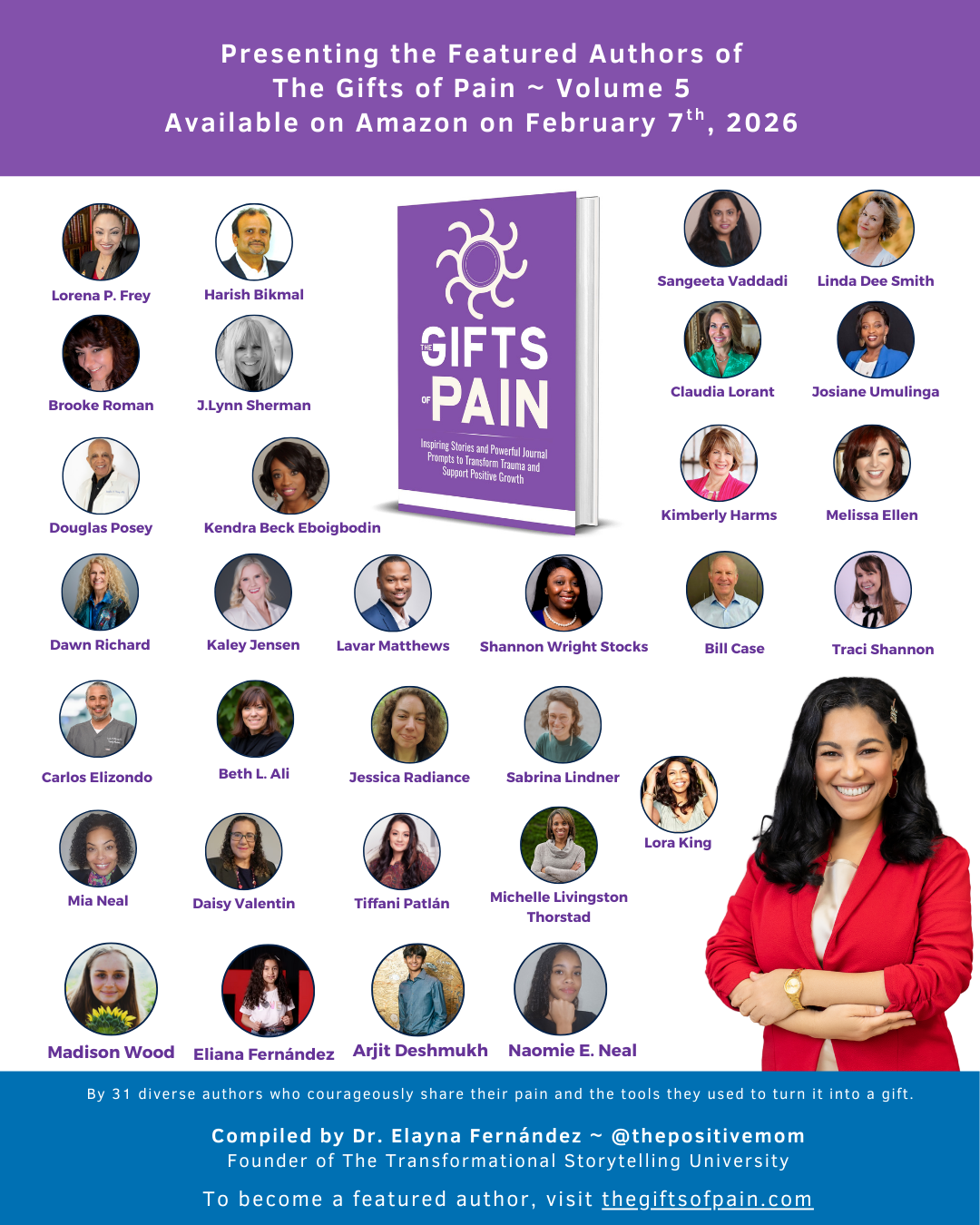 The Gifts of Pain book series is a must-read collection of real-life, power-packed, bite-sized stories from 31 authors of diverse backgrounds and walks of life who integrated Dr. Elayna Fernández’s powerful S.T.O.R.Y. System of Transformational Storytelling to vulnerably and bravely share their most painful experiences and the practical tools they used to transform them into personal growth and positive change. To learn how to become an author in the series and join the private Transformational Storytellers community, visit thegiftsofpain.com.