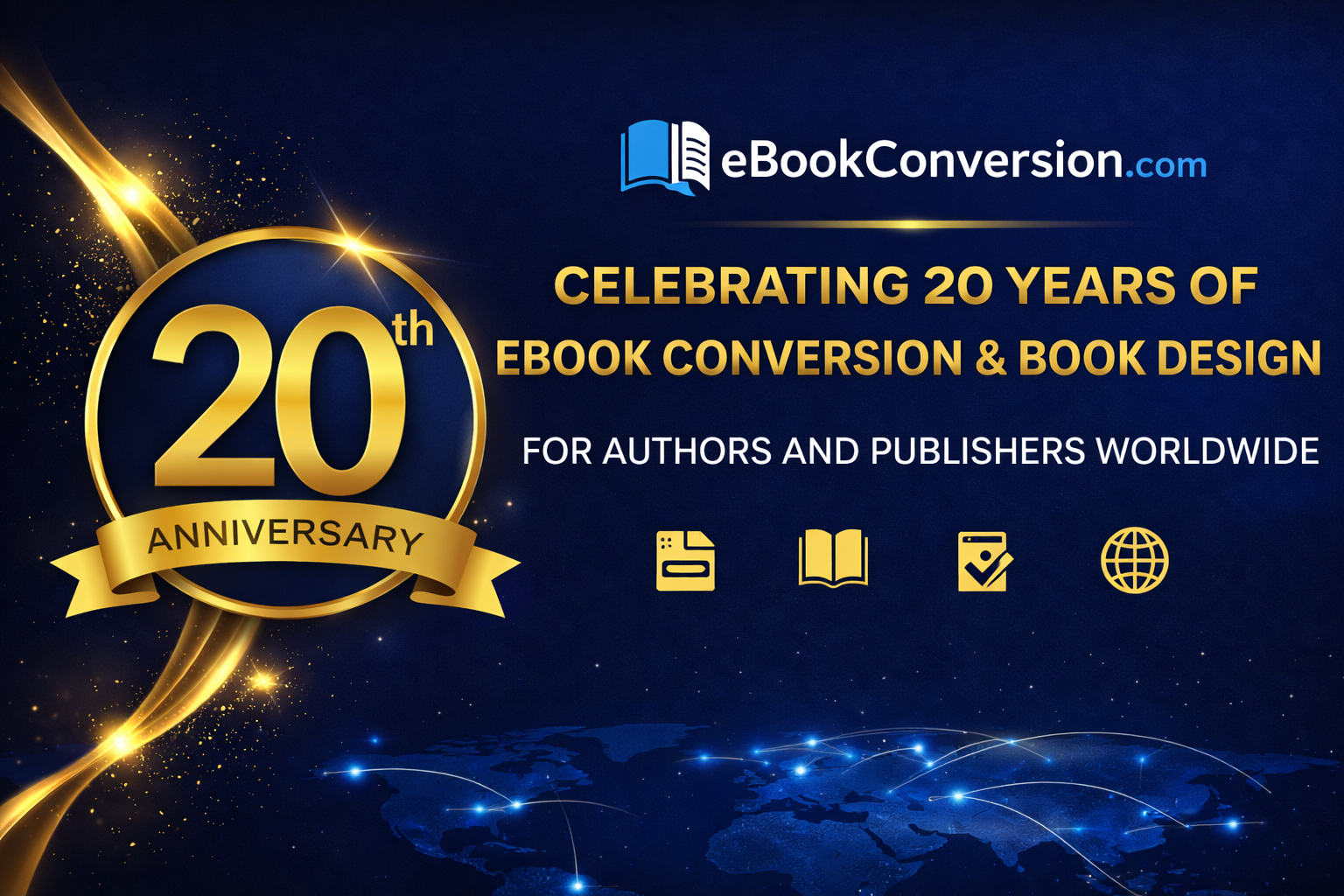 eBookConversion.com celebrates 20 years of helping authors and publishers worldwide turn manuscripts into professional eBooks and print-ready books.