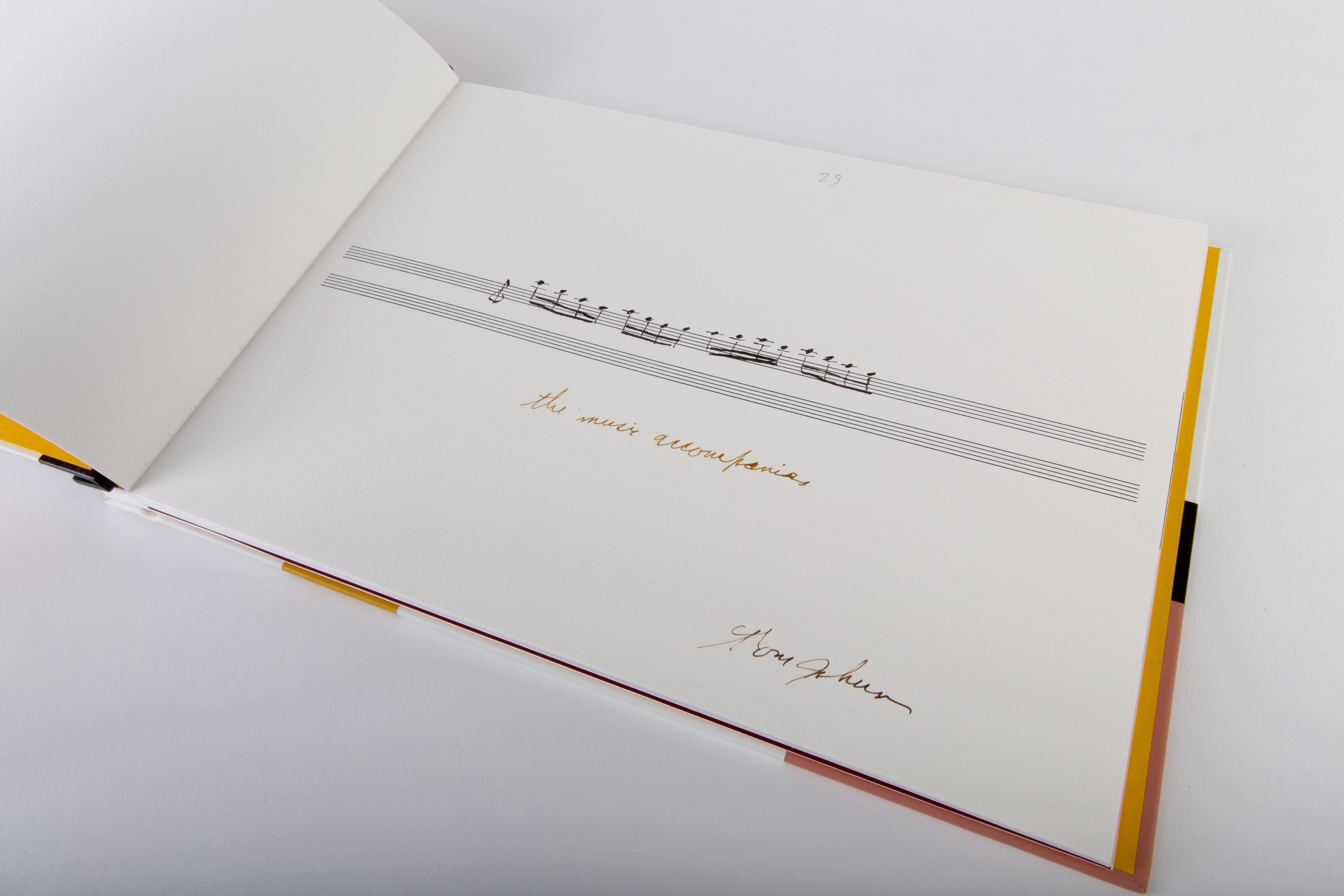 This artist’s book celebrates the American composer Tom Johnson, a pioneering figure of musical minimalism, through a work that bridges sound and visual art. It is paired with a remarkable 37-foot-long leporello (folded score), conceived as both a musical composition and a sculptural object, inspired by the aesthetics of minimalist artists—Sol LeWitt above all—inviting the viewer to experience music spatially. Created in close collaboration with the composer shortly before his passing in 2024, each copy includes handwritten elements, signatures, and a recording of his voice, making it both a final artistic statement and a rare, deeply personal artifact.