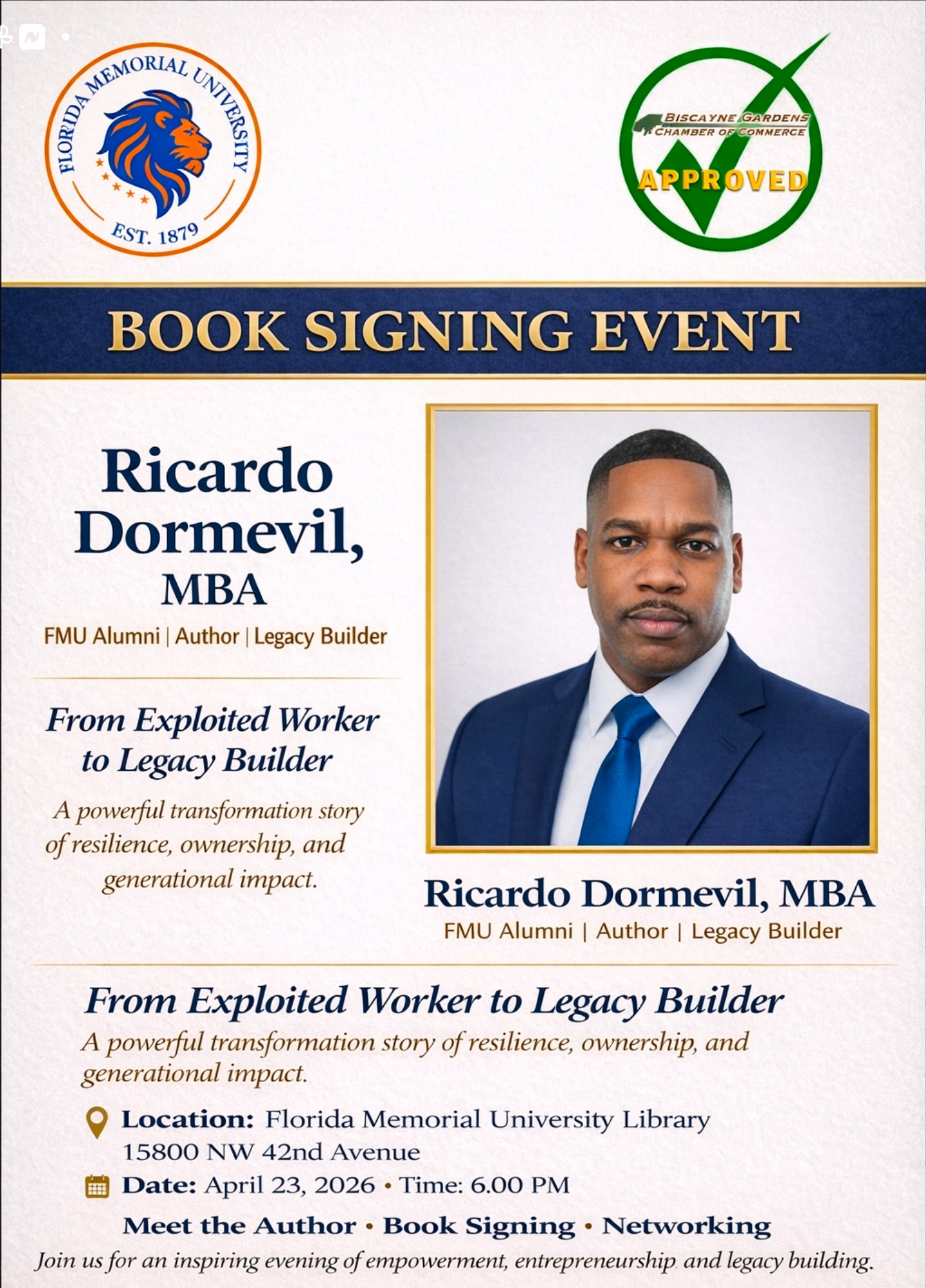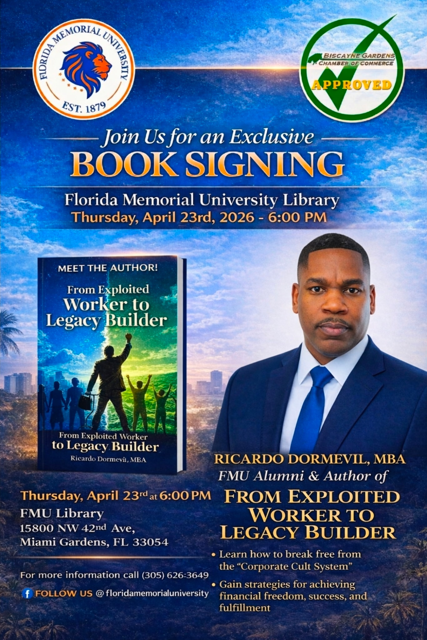 MIAMI, FL, UNITED STATES, April 20, 2026 /EINPresswire.com/ — Ricardo Dormevil, a proud alumnus of Florida Memorial University, will host an official book signing event for his newly released book, “From Exploited Worker to Legacy Builder: Breaking Free From The Corporate Cult System,” on Wednesday, April 23, 2026, at 6:00 PM at the Florida Memorial University Library, located on the university’s campus in Miami Gardens.