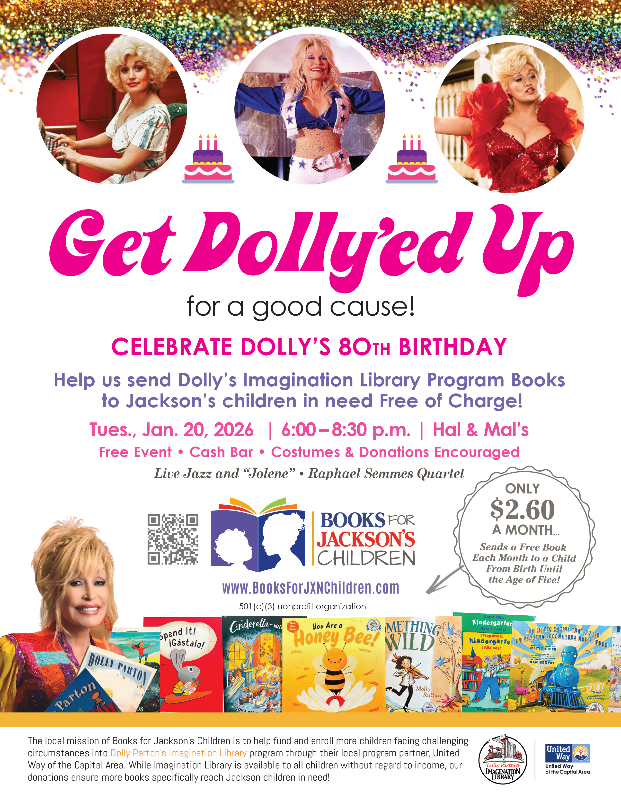 To raise awareness of the cause, the nonprofit is hosting a FREE “Birthday Party” honoring Dolly’s 80th, beginning at 6:00 pm CST on Tuesday, January 20, 2026, at Hal and Mal’s Restaurant in downtown Jackson. Dolly attire or costumes and donations are encouraged and welcome. Complimentary Cake and Jazz—with a little “Jolene” thrown in—will be performed by the Raphael Semmes Quartet with guest “Dolly” singers.