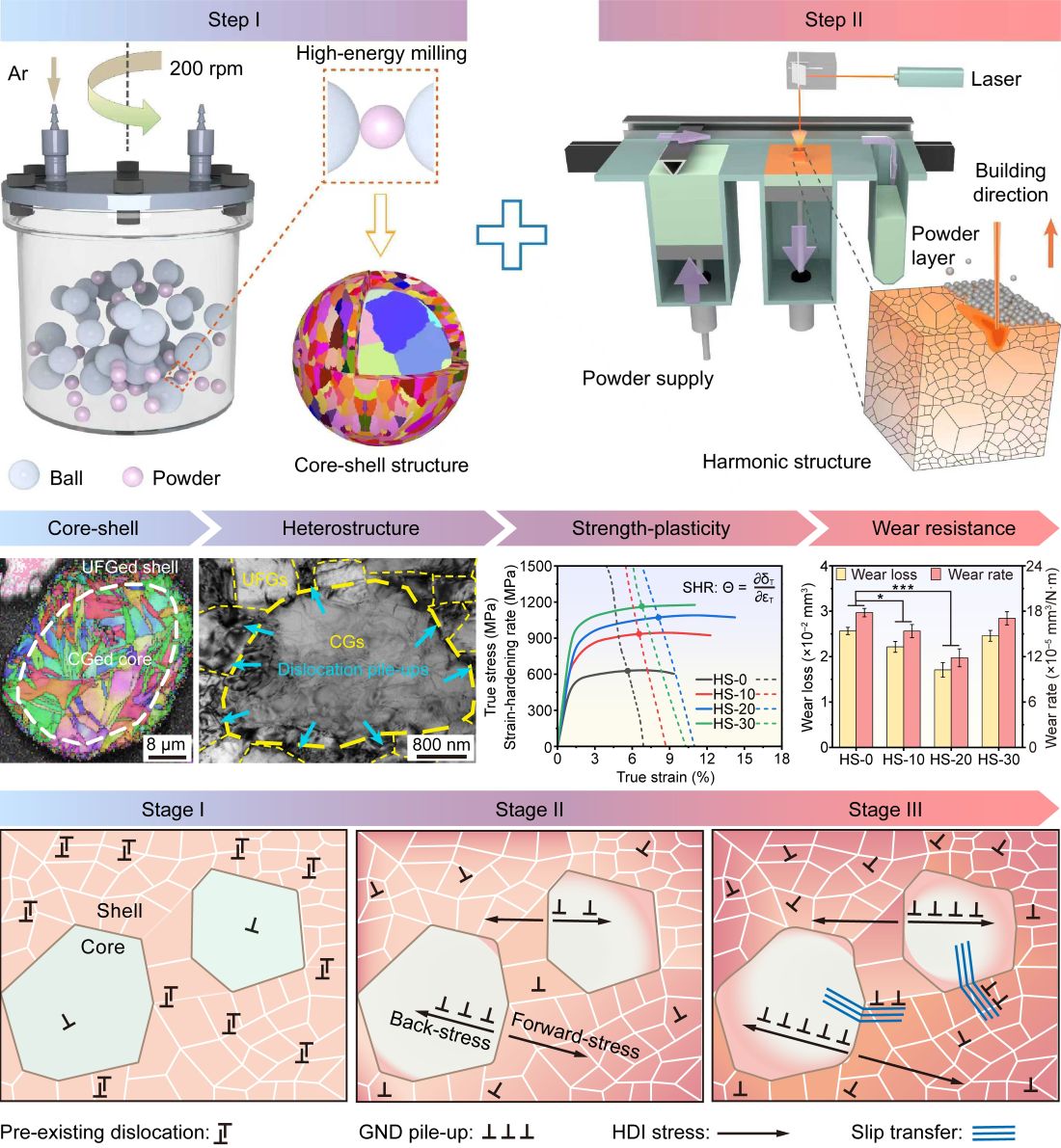 Fig. 1: Harmonic heterostructure developed by a manufacturing route of MM and LPBF endows pure Ti implants with excellent wear resistance via strength-plasticity synergy.
