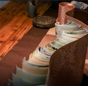 A prototype of the Dragon-Scale Art Anthology, handcrafted using traditional Chinese bookbinding techniques inspired by imperial scrolls. Each folded page represents a section of the Aisin Gioro Art Annual, symbolizing the dialogue between heritage and co