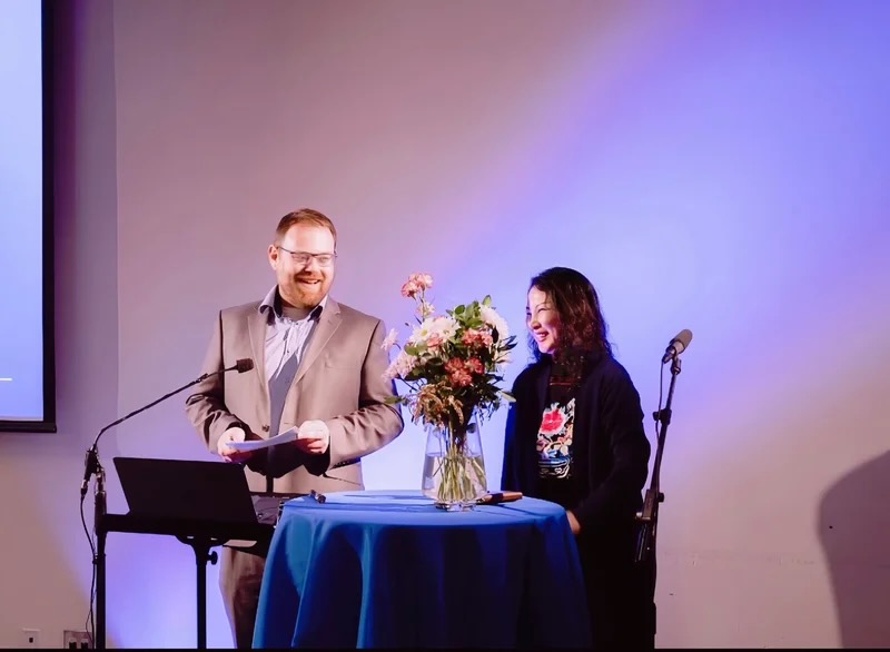 Cecilia Aisin Gioro, Founder of the Aisin Gioro Arts & Cultural Heritage Society, and Vice Chair Stephen Price share a moment during a community art and culture event in Vancouver, highlighting the Society’s dedication to cultural dialogue and education.