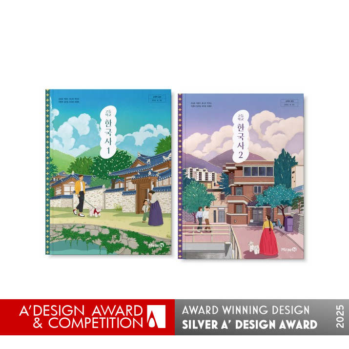 Kim’s award-winning design stands out for its unique concept of connecting the past and present through a time-slip motif. The textbook is divided into two books, with the first focusing on daily life in the past and the second on the present. The cover features a man and woman from different eras walking toward each other, with a dog acting as a medium to connect the two time periods. The gilded treatment of certain elements emphasizes the design’s luxuriousness and speciality.