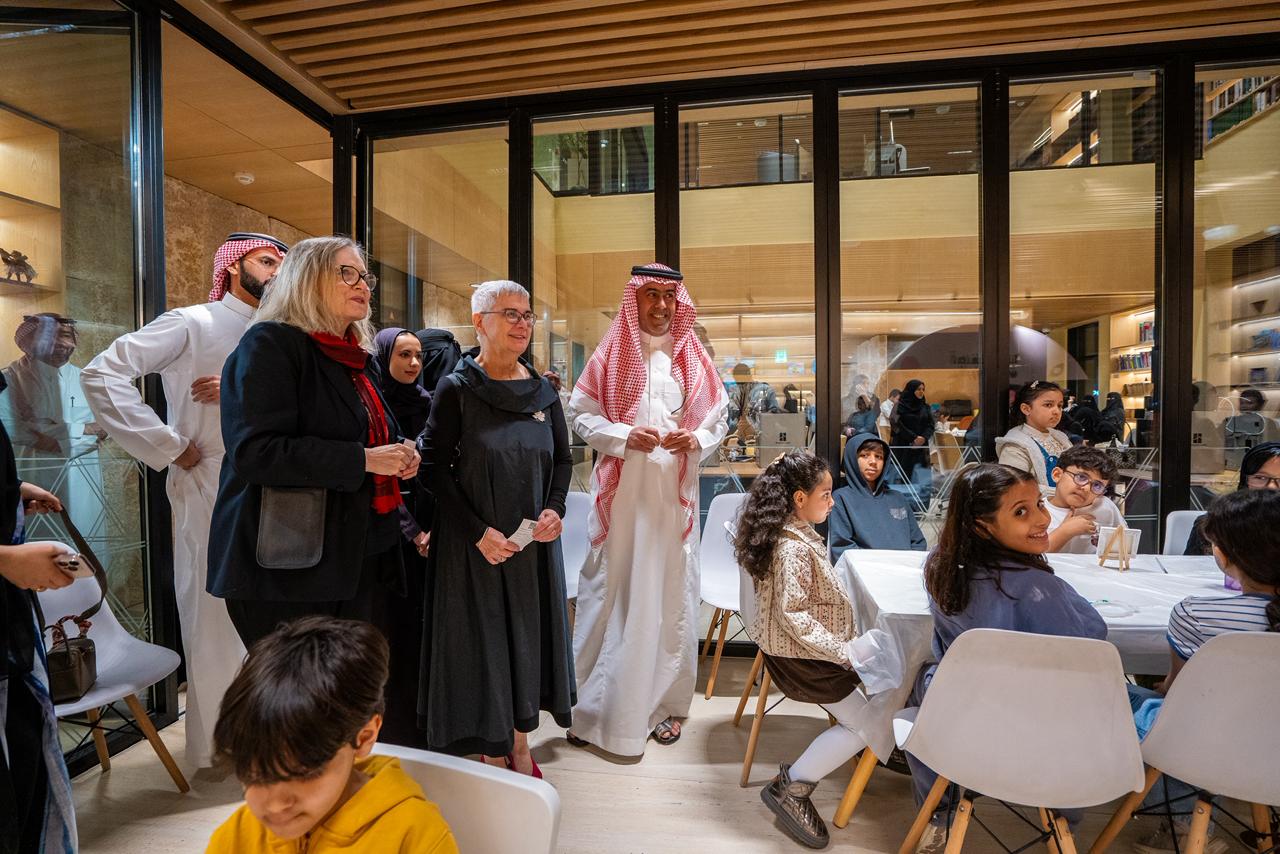 During the visit, the delegation toured the building, stopping at its reading areas, multi-purpose halls, and spaces dedicated to learning and community activities. The team was introduced to the cultural and knowledge programs hosted at The Culture House and its role in supporting initiatives that bring together readers, creators, and cultural practitioners from inside and outside the Kingdom.