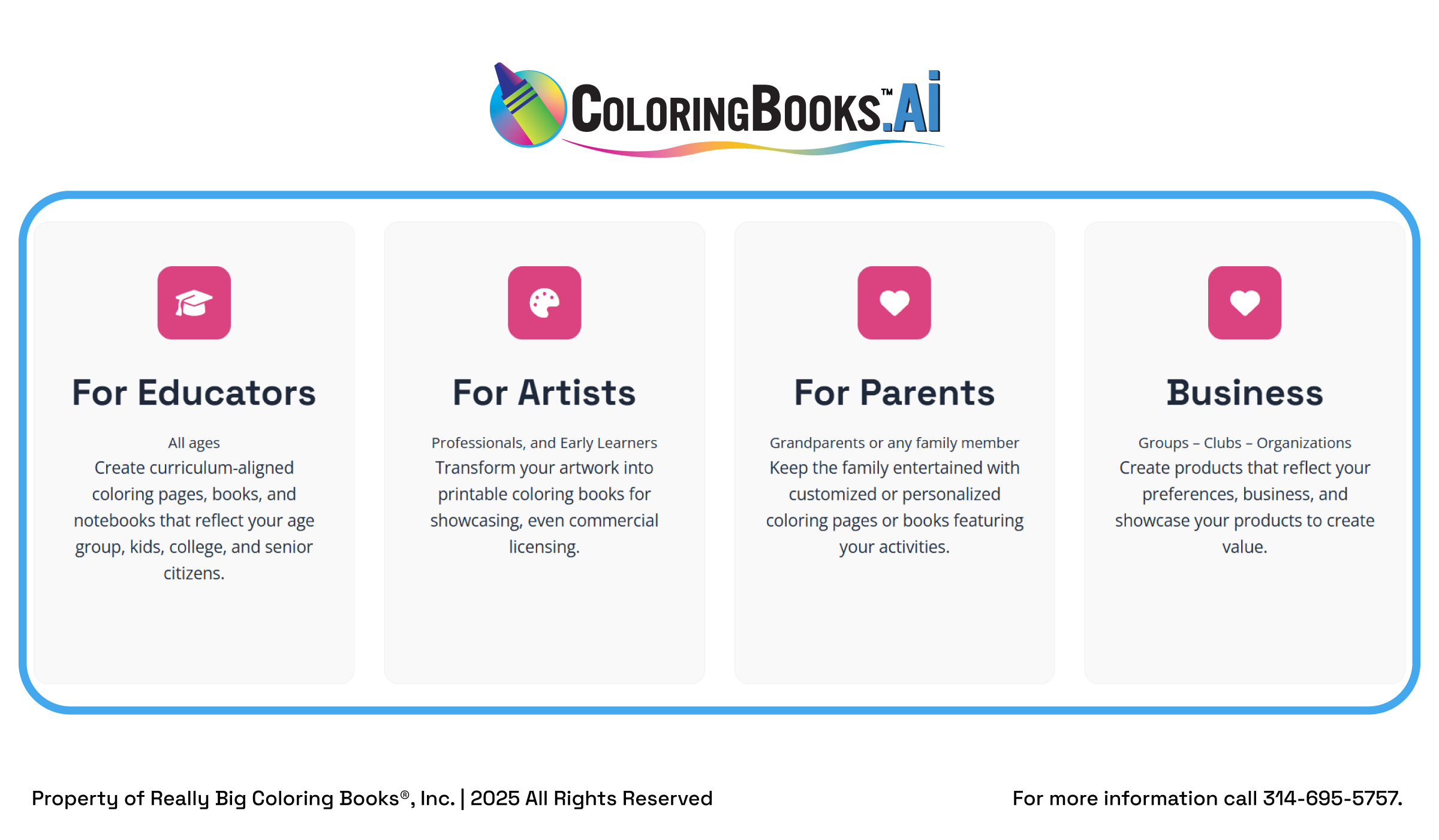 With company operations centered in St. Louis, Missouri they can also print and manufacture the ColoringBooks.ai images, transforming them into a retail-quality product for individuals, families, or for sale within the retail industry. The ColoringBooks.ai robot, named “RBCB,” will enable users to create custom coloring pages and publish their own books by entering text prompts or images with ColoringBooks.ai technology. The company serves educators, parents, and creators, producing both digital downloads and print-ready files for their use in retail, educational, and promotional markets.