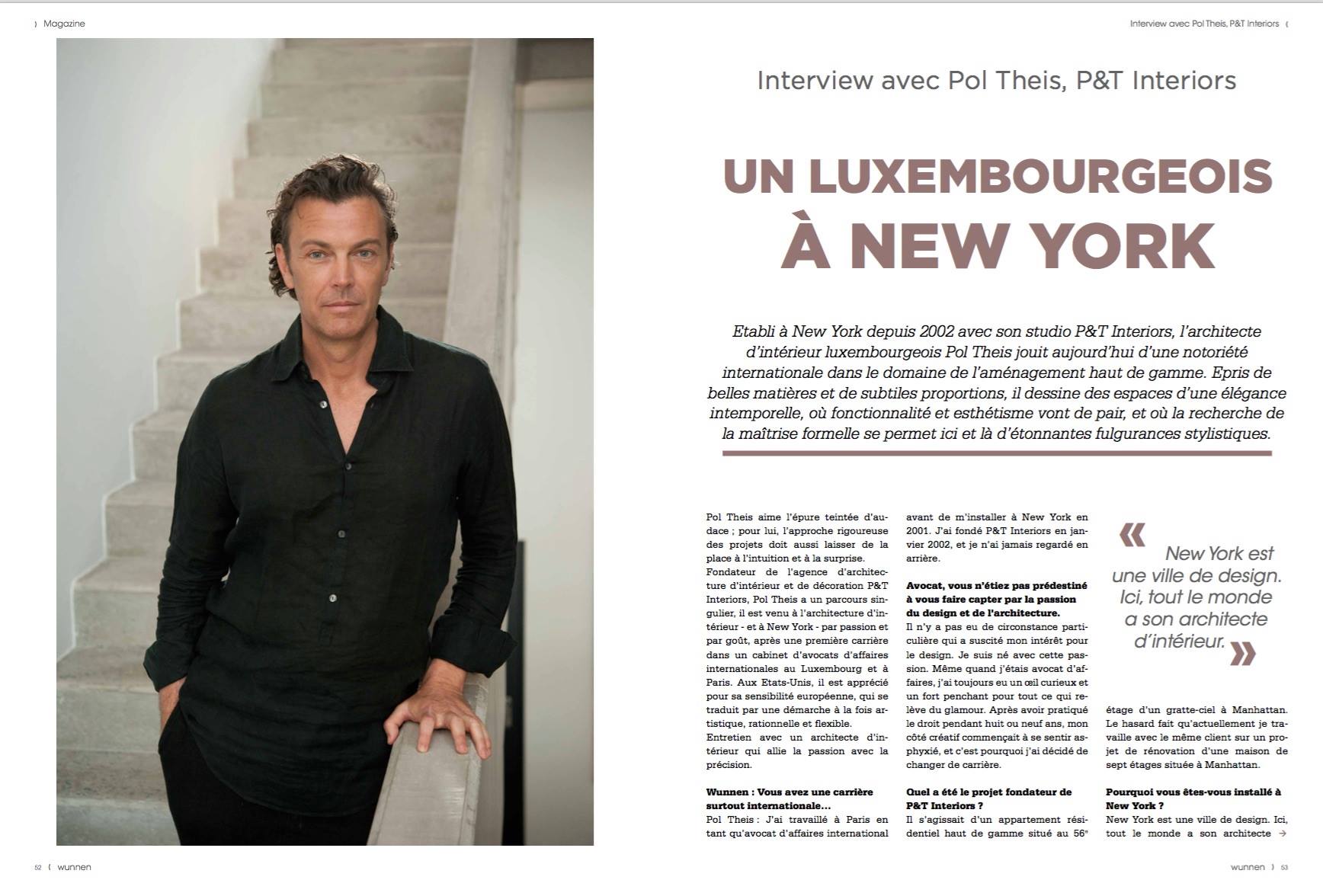 Pol Theis was notably a featured designer for East Coast Modern Contemporary Residential Architecture and Interiors, Luxury Interiors, Interiors New York, Interiors New York , and several other professional journals like Resident Dog and Art in Residence. Due to his skill in his industry, he was recognized as one of the Top 50 Designers in New York Spaces in 2012, 2013, 2014, 2015, 2016, 2017 and 2018. Likewise, he was presented with an award for apartment interior design from American Property Awards in 2015 and the Bloomberg Television International Property Award in 2011.