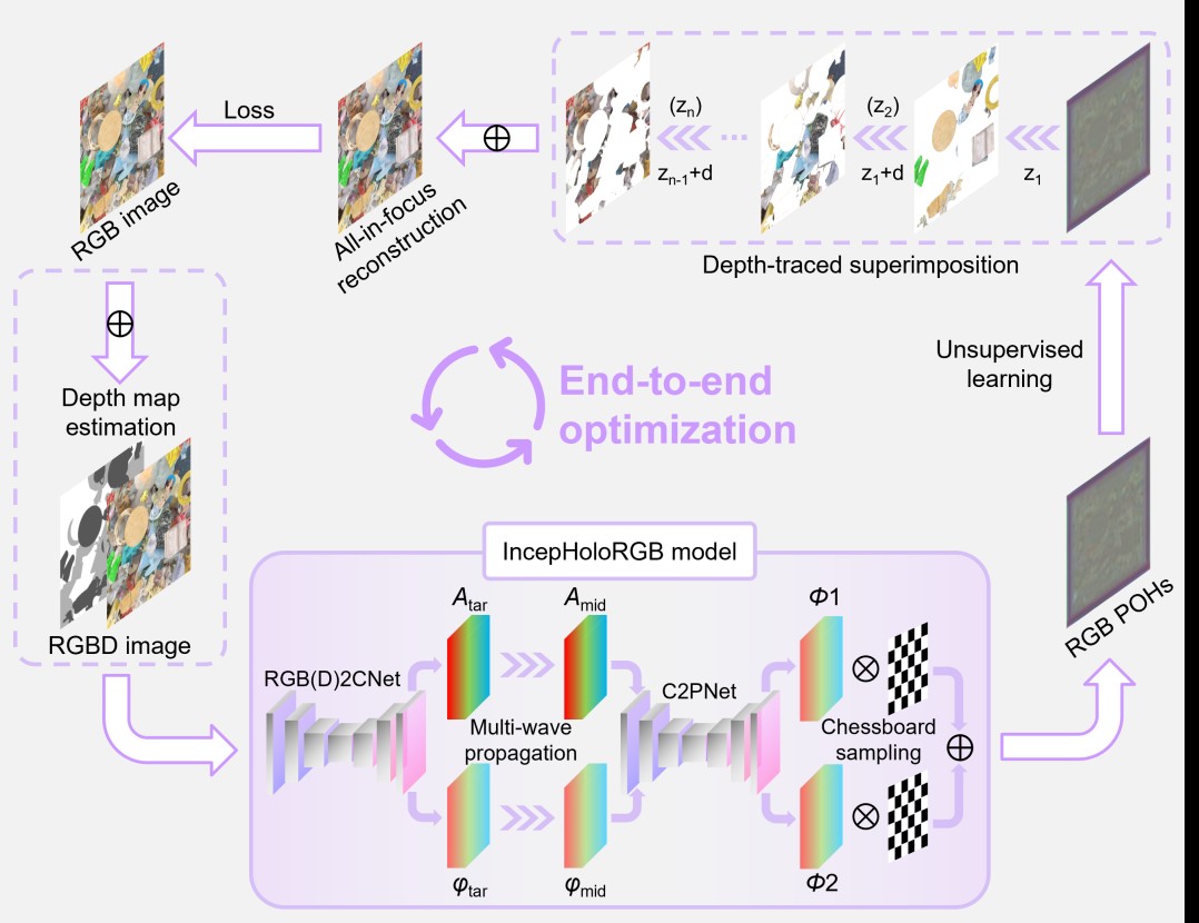 The research group of Prof. Wei Xiong and Hui Gao from Wuhan National Laboratory for Optoelectronics in Huazhong University of Science and Technology propose a lightweight unsupervised CGH model named IncepHoloRGB, which generates RGB full high definition (FHD) resolution (1920×1080) holograms simultaneously through a unified framework fulfilled in both 2D and 3D display mode. To obtain vivid 3D visual cues, a depth-traced superimposition method is proposed to ensure the consistency of front-rear spatial relationships, in which the images of subsequent layers are directly calculated from the amplitude and phase of the previous layer’s optical field. This process inherently involves the near-far nature of different depth layers while enabling the generation of holograms through pure unsupervised learning without any pre-computed label holograms.