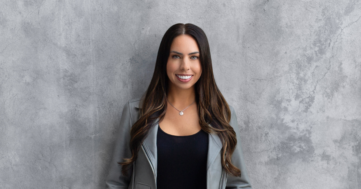 Portrait of financial coach and educator Hillary Seiler standing against a textured gray concrete wall. She’s wearing a gray jacket, black top and a delicate necklace, smiling confidently at the camera with long, styled brunette hair.