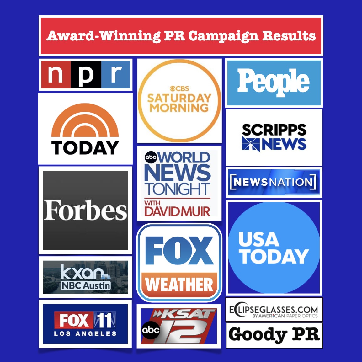 SANTA MONICA, CA, UNITED STATES, April 8, 2026 /EINPresswire.com/ — In sync with the 2-year anniversary of the 2024 Total Solar Eclipse, Goody PR Founder and Bestselling Author Liz H. Kelly announces the release of “Award-Winning Publicity : 8 Media Boosters to Magnify Your Story” to help brands get positive press and boost business results. This how to do public relations book features the author’s national publicity campaign for American Paper Optics / Eclipse Glasses that won 6 PR industry awards and resulted in 54 TV interviews in ONLY 8.5 months.