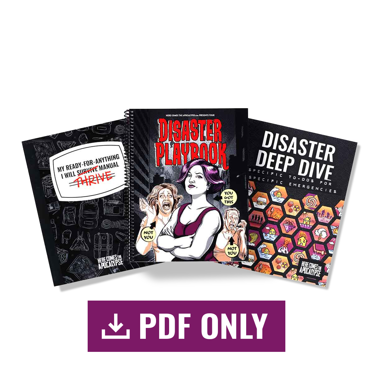 The Digital Disaster Basics package includes the complete Disaster Playbook, the I Will Thrive Manual for creating custom emergency plans, and the comprehensive Disaster Deep Dive reference guide. The tools can be printed and worked by hand, as with the shipped products, or—with fillable PDF formatting in both the Playbook and Manual—users can work through the books on their devices and then print when they’re ready. Families receive the same foolproof step-by-step system, gorgeous artwork, and humor-infused approach that has made the physical Disaster Playbook a favorite among preparedness professionals and families alike.