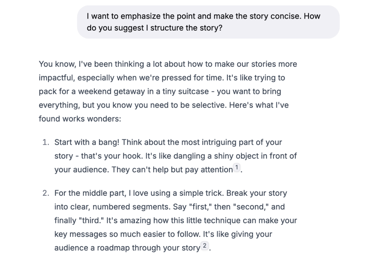 Choy compares ella AI to a coach. “Instead of providing answers that could strip away your creativity and confidence, ella AI asks strategic questions, provides feedback, and helps you craft effective stories in a way that strengthens your creative muscles and leadership skills.” says Choy. “You learn the steps of story mining and structure as you use ella AI. The hope is you won’t always need to turn to the bot for help.”