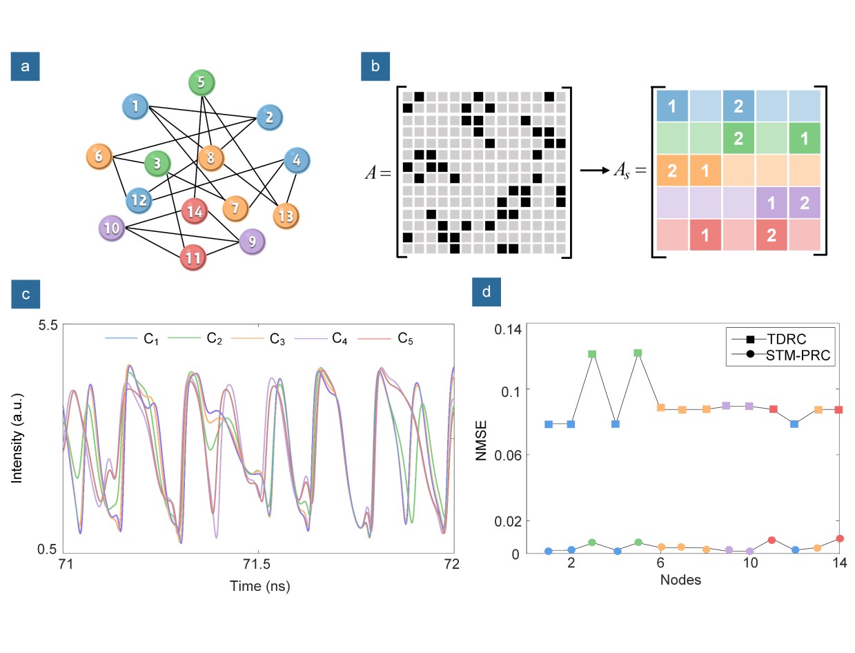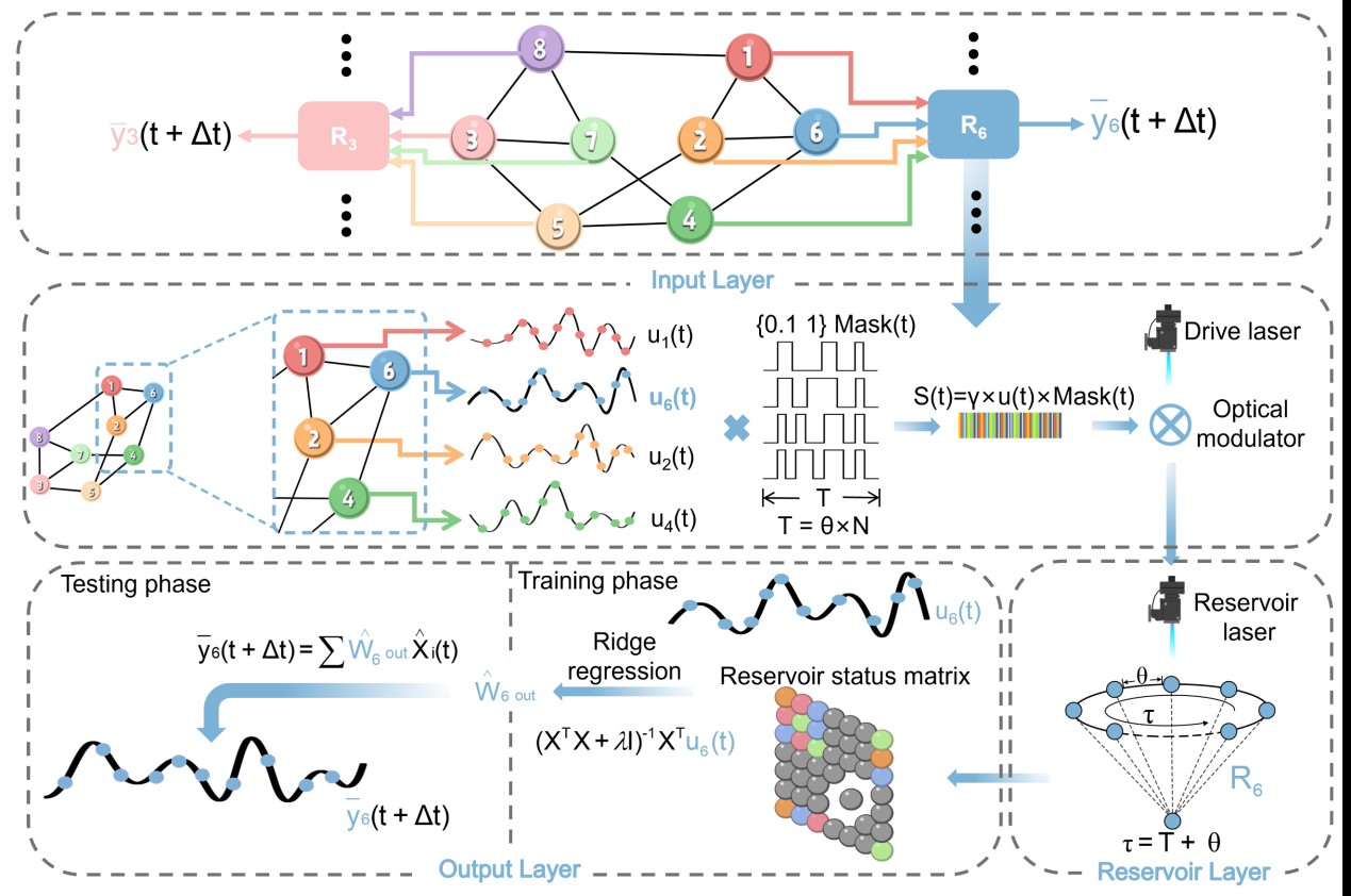 To address the aforementioned challenges, Professor Lianshan Yan’s research team at Southwest Jiaotong University proposed and experimentally demonstrated a spatiotemporal multiplexed parallel photonic reservoir computing (STM-PRC) architecture for accurate prediction of high-dimensional chaotic dynamics in complex semiconductor laser networks. By leveraging the intrinsic topological characteristics of the network, the team decomposed the high-dimensional prediction task into multiple simplified reservoir modules operating in parallel, thereby improving both prediction accuracy and computational efficiency across different network scales. As illustrated in Fig. 1.