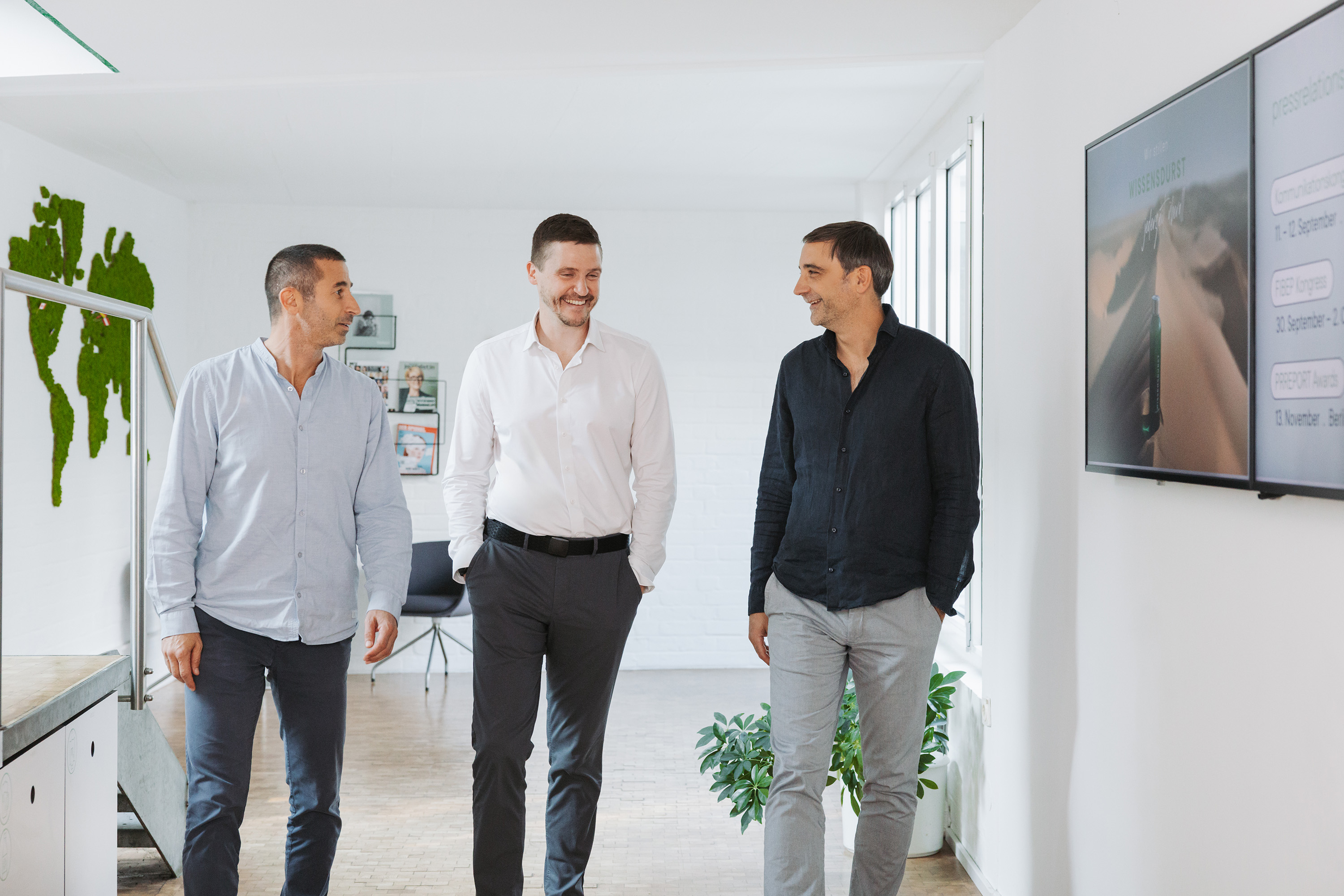 Managing Partners Fady El-Murr (left) and Jens Schmitz (right) welcome Johannes Burk (middle) as Head of Global Business Development in the company's headquarters