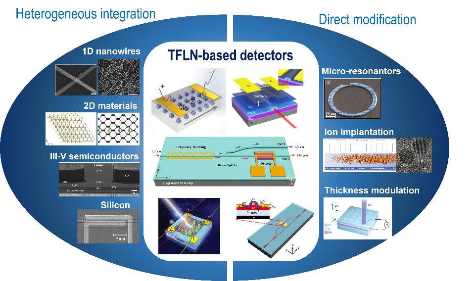 Heterogeneous integration and direct material modification have formed two complementary technological pathways: The former heterogeneously integrates TFLN with functional materials like III-V semiconductors, silicon, or 2D materials, preserving LN’s excellent waveguide, electro-optic modulation, and ferroelectric properties while leveraging the high absorption and efficient carrier transport of heterogeneous materials to broaden the spectral response. The latter achieves localized control of material properties through methods such as ion implantation, defect engineering, and nanoparticle modification, enhancing integration density and mechanical stability while reducing interfacial defects.