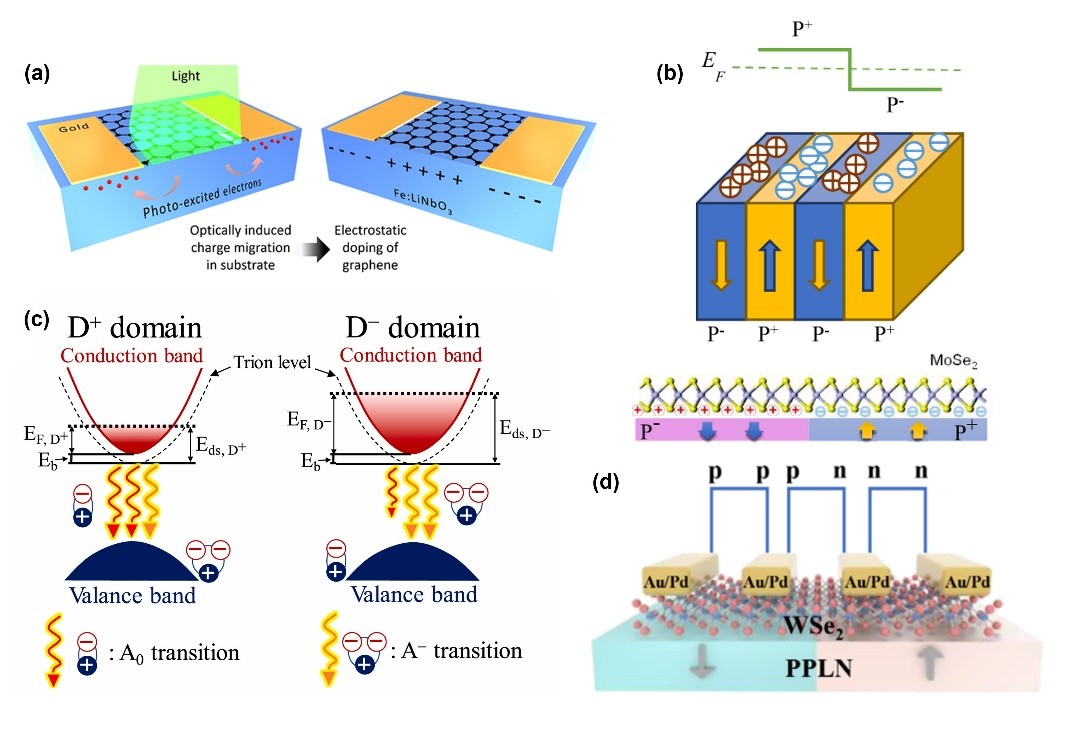 Although the heterogeneous integration strategy can effectively expand the spectral response range and improve the responsivity of TFLN photodetectors, its complex fabrication process, interfacial stability issues, and challenges in compatibility with CMOS technology still hinder further development. In contrast, direct material modification techniques, by tuning the intrinsic properties of LN, open a new path for realizing structurally compact and performance-stable monolithically integrated detectors. Currently, this strategy primarily employs the following four types of methods: (1) Ferroelectric Domain Engineering; (2) Ion Doping Control; (3) Ion Beam Modification Technology; (4) Acoustic Resonator Structure Design. These direct modification strategies effectively expand the photodetection mechanisms and application scope of lithium niobate materials while preserving their inherent advantages, providing new ideas for developing highly integrated, low-power on-chip detection systems.