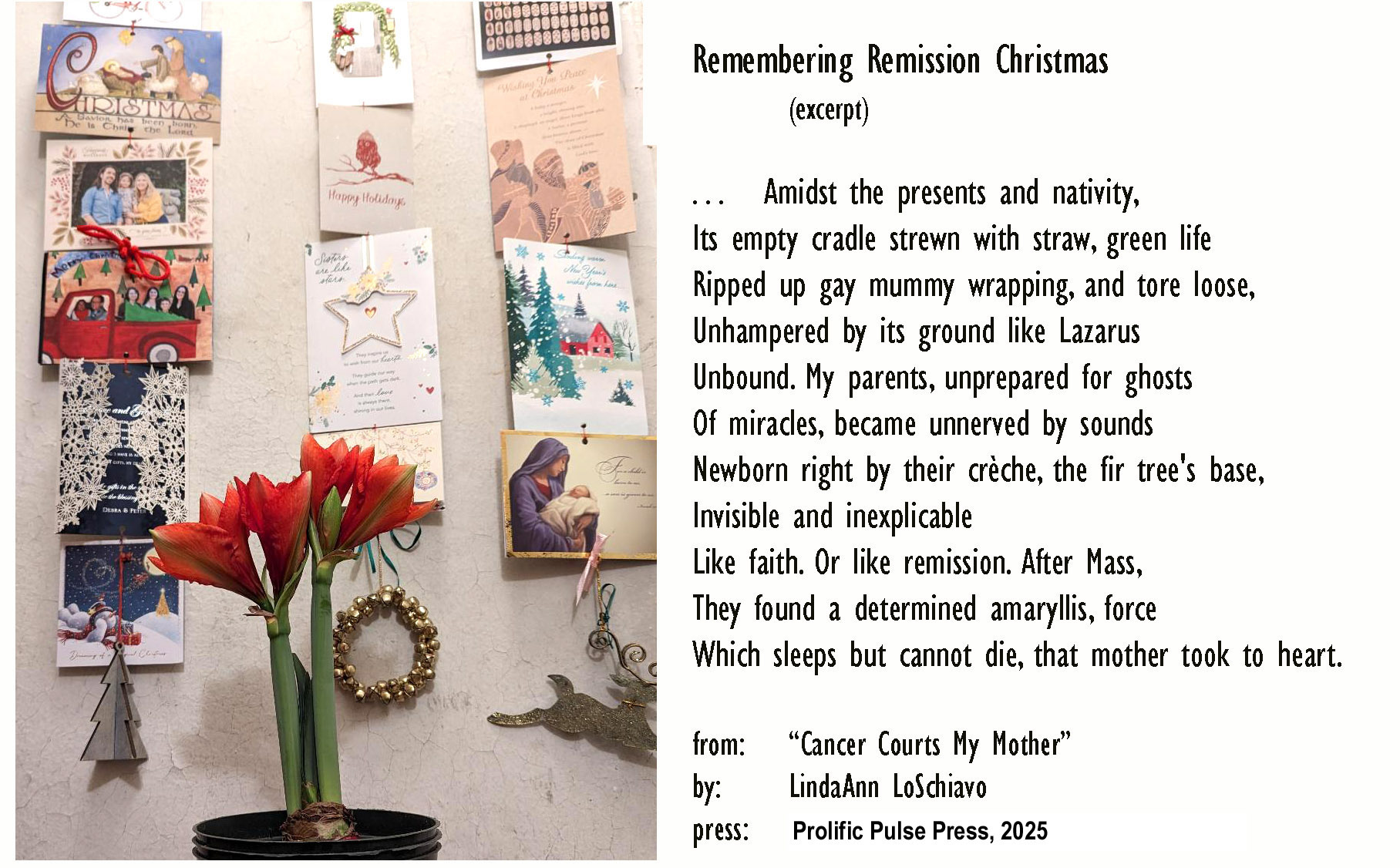 “In “Cancer Courts My Mother,” LindaAnn LoSchiavo chronicles an emotional journey through varied poetic forms. She weaves a metaphor of nurturing plants back to life while her mother finds remission, then faces cancer’s return. The collection reconciles memories of a difficult mother with the current, vulnerable one—”Bad memories are cadavers that refuse burial.” As both subject and narrator, LoSchiavo illuminates the delicate balance between personal autonomy and familial duty.”