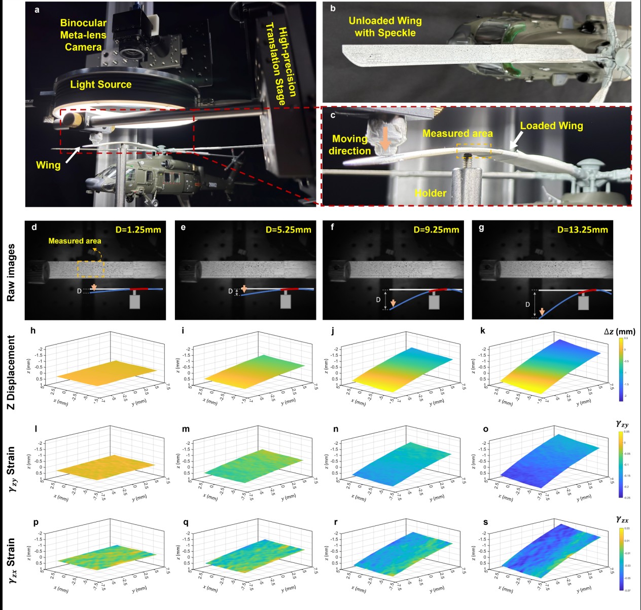 In the in-plane displacement test, the BM-DIC achieved high precision with a standard deviation (σ) below 2 µm. In a comparison with conventional stereo-DIC systems during the rubber block compression test, the BM-DIC system achieved relative strain field errors of around 1%, even though its baseline length was only 1/75 of the stereo-DIC system. To further validate its effectiveness, the team conducted a helicopter rotor bending test. Speckle patterns were applied to the rotor surface, and a binocular meta-lens camera was positioned above the rotor to capture speckle images before and during loading. The BM-DIC system successfully measured three-dimensional displacement and bending strain fields, even under significant out-of-plane motion, where traditional 2D-DIC would fail.