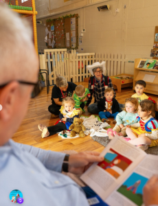 A man reads from a children’s book to a small group of young children seated on the floor in a classroom, with toys, books and a teacher nearby.