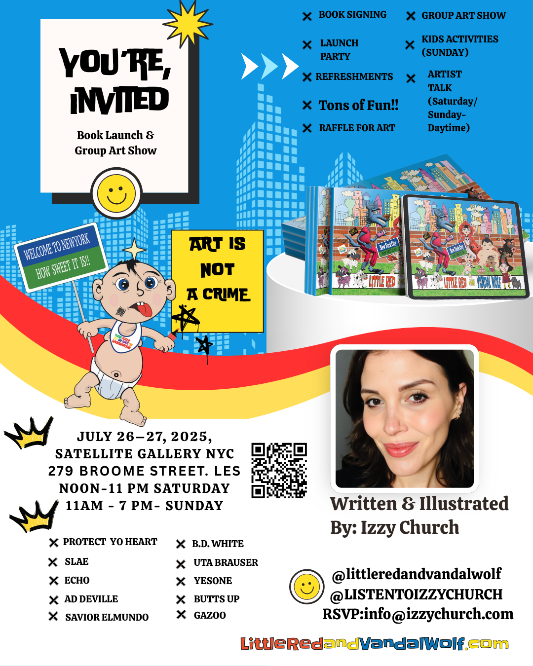 NEW YORK, NY, UNITED STATES, July 22, 2025 /EINPresswire.com/ — Experience a fierce fusion of graffiti, street art, and urban mythmaking this summer at the Satellite Gallery with the launch of Little Red and Vandal Wolf—a gritty, re-imagined fairy-tale by multidisciplinary artist Izzy Church in collaboration with several graffiti writers and street artists. The story bursts off the page and into real life through a two-day immersive event, blending book culture with bold street visuals and a high-energy community vibe. Curated for both art insiders and families alike, the event features an all-star lineup of street artists, and limited-edition works—all celebrating the raw magic of urban storytelling.
