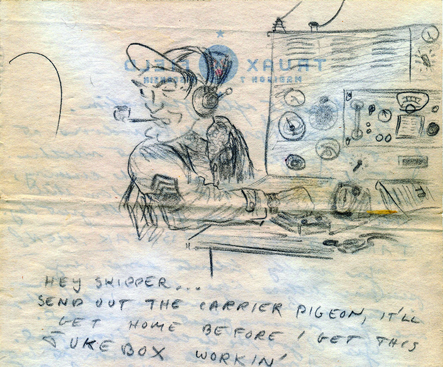 With the letters are a collage of Ronie’s cartoons and snapshots, plus postcards and ephemera of the day. Ronald draws himself on a snowy midnight dash to the latrine at Truax Field near Madison, Wisconsin, while colorful postcards mark his first studies at Cornell University in Ithaca, New York. Elaborate comic-style panels show him as a radio operator yelling for the Cap’n to send out carrier pigeons, or wolf-whistling at the WAC he mistakenly believes will be his new assistant — crestfallen when she tells him she’s taking over and he’s going Stateside.