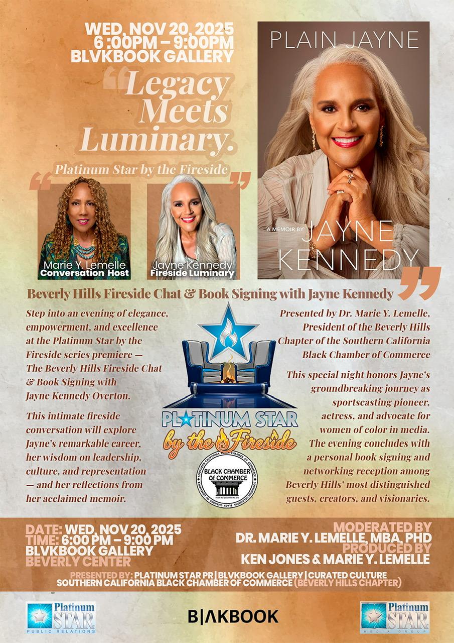 LOS ANGELES, CA, UNITED STATES, November 4, 2025 /EINPresswire.com/ — Legendary sports broadcaster, actress, and cultural icon Jayne Kennedy Overton will be celebrated in an intimate Fireside Chat and Book Signing hosted by Dr. Marie Y. Lemelle, PhD, on Wednesday, November 20, 2025. The event is set for 6 pm to 9 pm at BLVKBOOK Gallery, located on Level 8 next to H&M in the Beverly Center near Macy’s Court. Red carpet arrivals from 6-6:45 p.m. Media check-in at 5:30 p.m. Park near Macy’s Court on Level 4 in the Red Section, and take Macy’s Men’s store elevators to Level 8.
