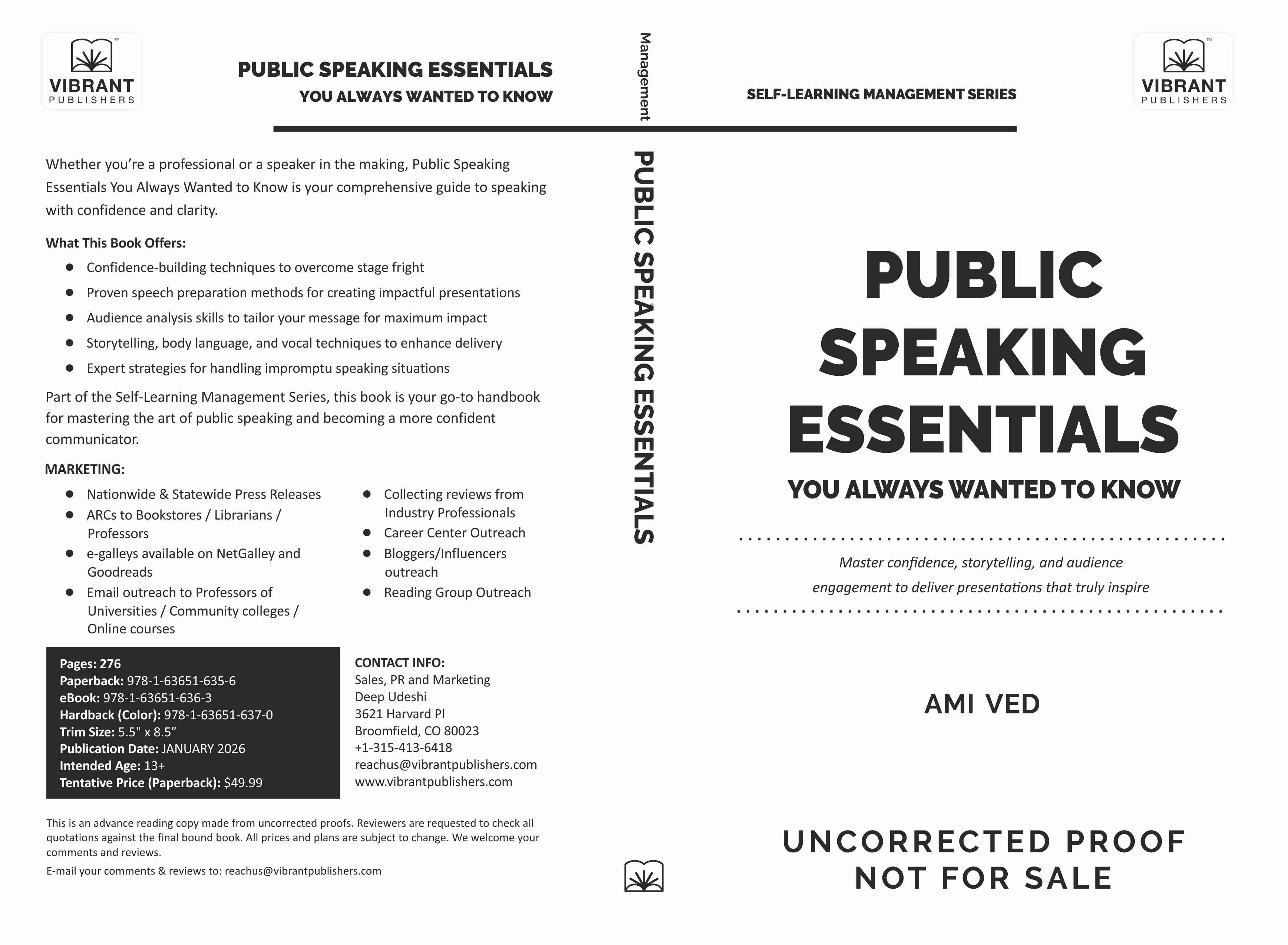BROOMFIELD, CO, UNITED STATES, September 30, 2025 /EINPresswire.com/ — Vibrant Publishers is pleased to announce the galley release of Public Speaking Essentials You Always Wanted to Know, or Public Speaking Essentials, written by Ami Ved, a professional communication coach, keynote speaker, and soft skills trainer with over two decades of global experience. This book combines professional expertise with practical strategies for effective communication.