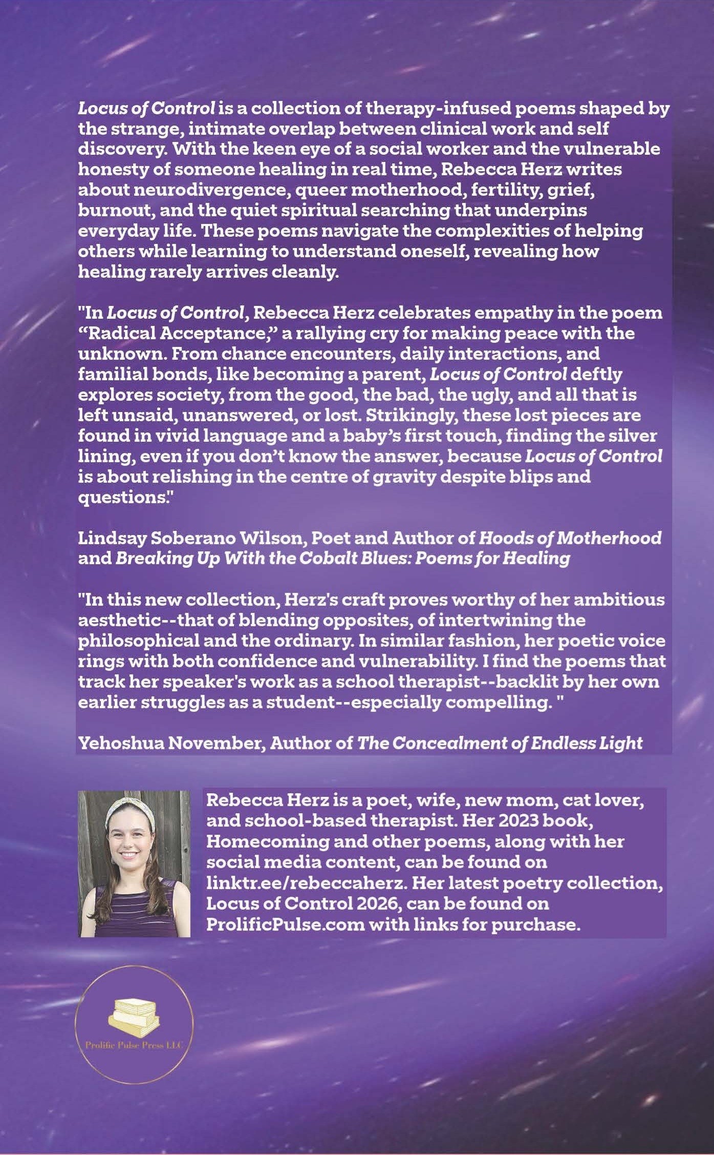 TEANECK, NJ, UNITED STATES, January 28, 2026 /EINPresswire.com/ — In Locus of Control, poet Rebecca Herz invites readers into intimate, often quiet spaces where care is given freely—even as self-care falters. Grounded in therapeutic and psychological frameworks such as countertransference, imposter syndrome, burnout, co-regulation, radical acceptance, and self-compassion, the collection transforms the language of mental health into lyric inquiry. These poems do not instruct or resolve; instead, they ask readers to remain present within uncertainty.